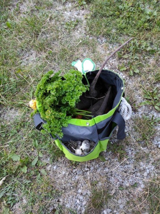Ich nutze ein Gartenwerkzeug-Set von WORKPRO, das alle notwendigen Werkzeuge inkl. Handschuhe (Einheitsgröße) enthält. Die Holzgriffe liegen sehr gut in der Hand. Die Tragetasche könnt ihr für das Verstauen der Werkzeuge oder für eure Ernte verwenden.